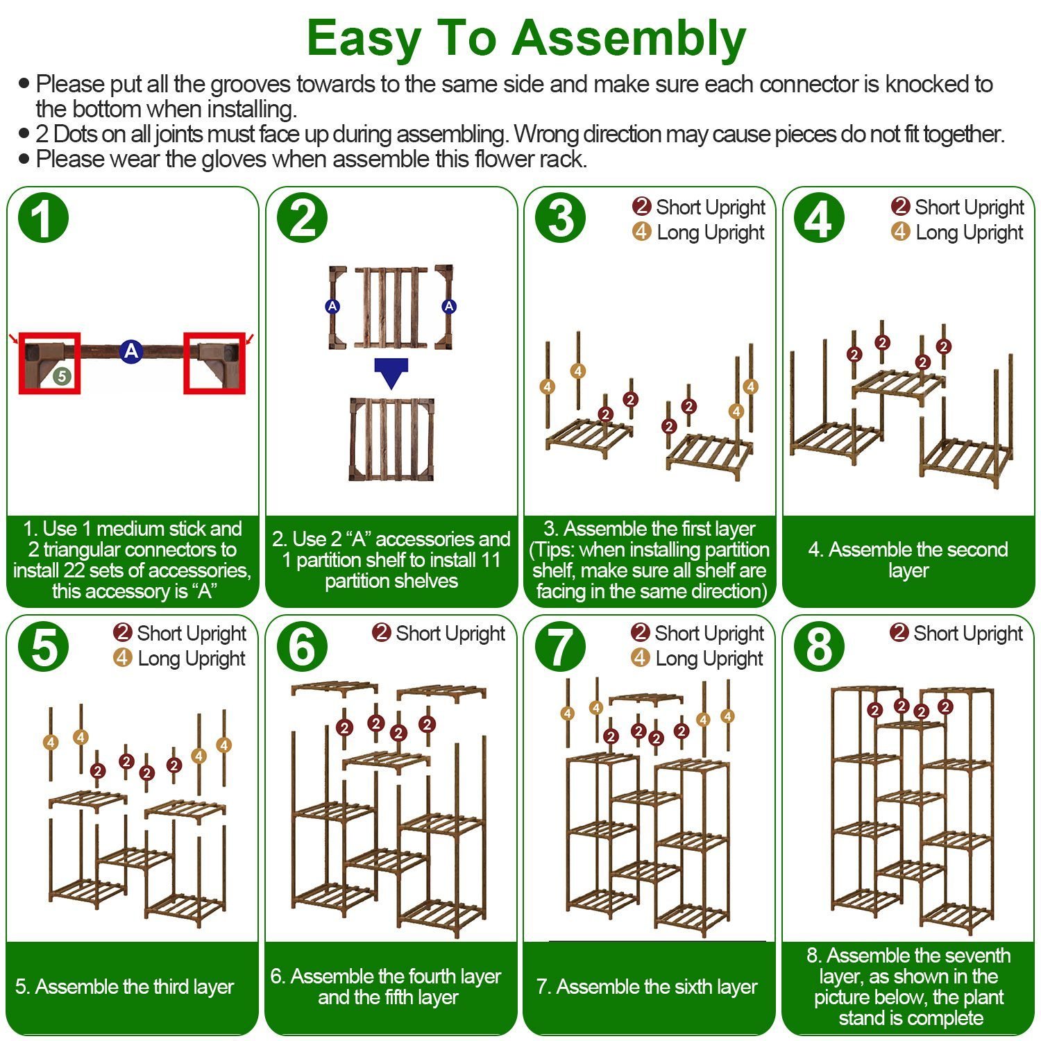 *Quick Assemble*:Come with detailed user guide,1 pairs of glove,1Pc oak hammer,no need other tools when assembling this flower rack. The plant holder is jointed with durable plastic connectors,basically repeat the same process. Ps:2 dots on all joints must face up during assembling. Wrong direction may cause pieces do not fit together.